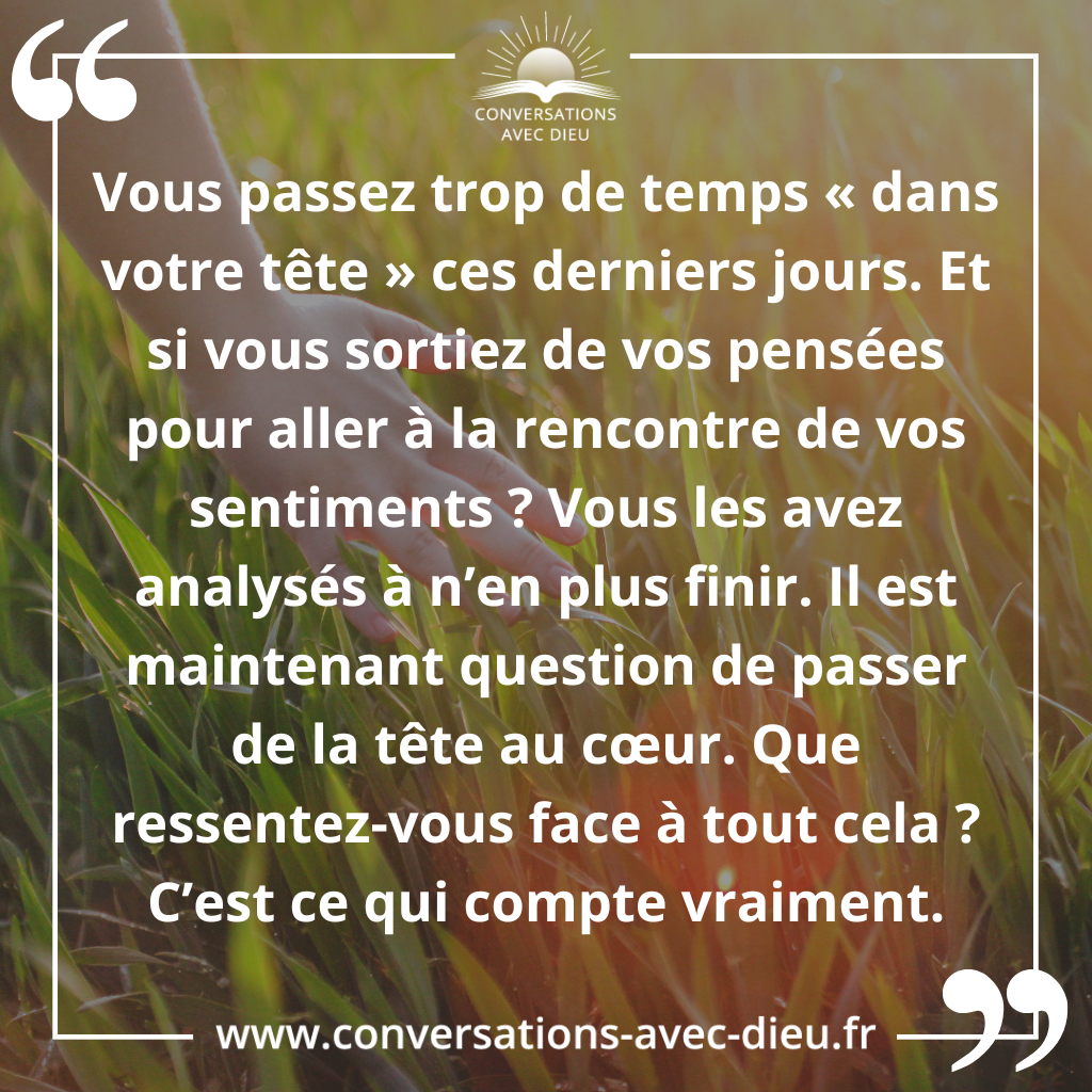 Vous passez trop de temps « dans votre tête » ces derniers jours. Et si vous sortiez de vos pensées pour aller à la rencontre de vos sentiments ? Vous les avez analysés à n’en plus finir. Il est maintenant question de passer de la tête au cœur.