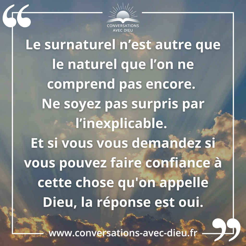Tout cela pour dire, ne soyez pas surpris par l’inexplicable. Et si vous vous demandez si vous pouvez faire confiance à cette chose appelée Dieu, la réponse est oui.