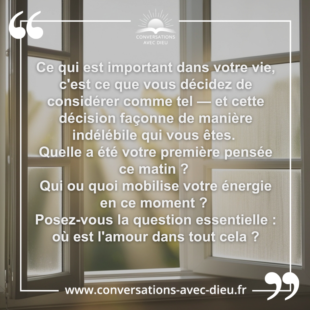 que ce qui est important dans votre vie, c’est ce que vous décidez de considérer comme tel, et cette décision façonnera de manière indélébile qui vous êtes.